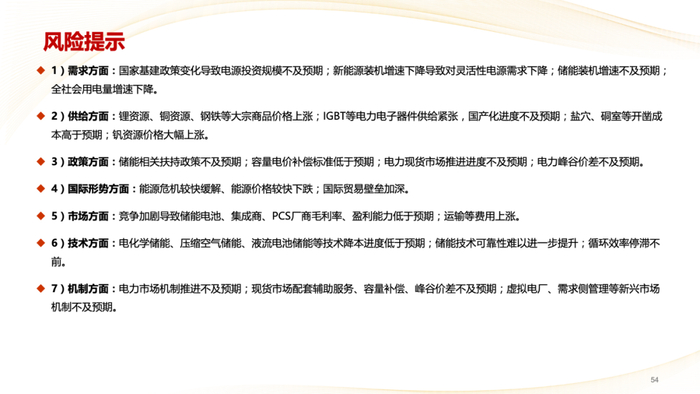 6)技术方面:电化学储能、压缩空气储能、液流电池储能等技术降本进度低于预期;储能技术可靠性难以进一步提升;循环效率停滞不前。