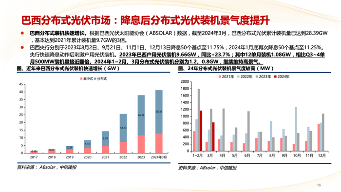 巴西分布式光伏:2024年1~2月、3月分布式光伏装机分别为1.2、0.8GW,继续维持高景气。
