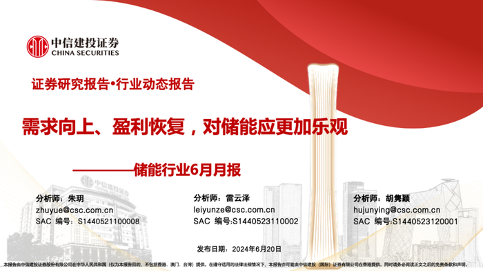 证券研究报告名称:《需求向上、盈利恢复,对储能应更加乐观——储能行业6月月报》