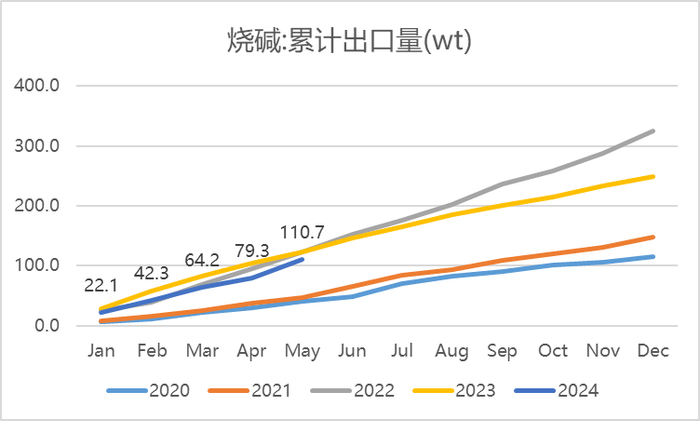 据海关总署数据统计,2024年1-5月中国烧碱累计进口在0.9万吨,同比-45%;1-5月累计出口在110.7万吨,累计同比-10%。