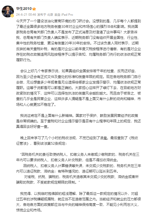 华生谈税收倒查30年传闻:不能见小利忘大义 惊搅企业和市场