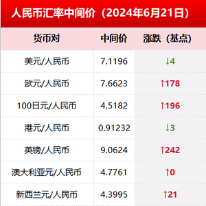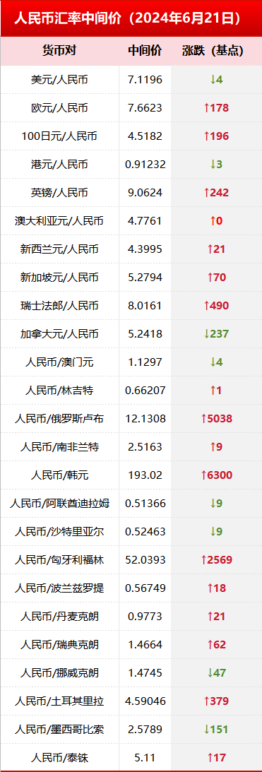 6月21日银行间外汇市场人民币汇率中间价 媒体滚动 2024.06.21 10:44 2024年6月21日银行间外汇市场人民币汇率中间价为1美元对人民币7.1196元。 中国人民银行授权中国外汇交易中心公布,2024年6月21日银行间外汇市场人民币汇率中间价,如下: