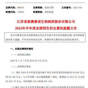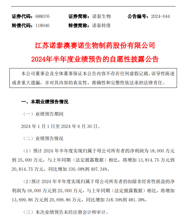 消息面上,诺泰生物发布了其在生物医药领域的半年度业绩预告,预计2024年上半年将实现净利润1.8亿至2.5亿元人民币,同比增长幅度达到330.08%至497.34%。扣非净利润预计也在同一范围内,同比大增318.59%至481.38%。业绩的显著提升得益于公司自选产品的市场放量和收入占比的大幅提升。