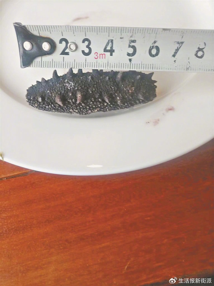 于是,苏先生按照说明书泡发了4根海参。可是,海参泡发后,也没有“海燕”承诺的那么大,苏先生用尺量了一下,长度也才10厘米左右。放在手里,一端在食指尖,一端在手掌心。