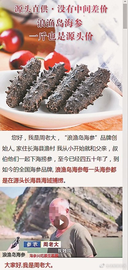 苏先生告诉记者,他老伴年初以来身体欠佳,于是就在百度上搜索如何能够改善身体状况,其中有的网页推荐吃海参可以滋补身体。于是,他就搜索食用海参的作用,在这个过程中,百度给他推荐了多个网页,有的是视频,有的是图文,其中,一个网页上写着“我是周老大,‘浪渔岛海参’品牌创始人,一斤也是源头价格,假一罚十”。