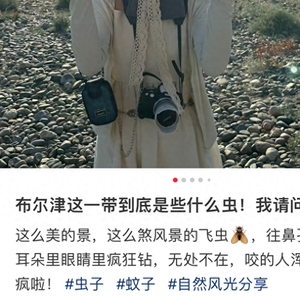 6月20日,经视直播记者联系上文章发布者马女士。马女士介绍,6月12日,她们一行六人去新疆旅游,到达新疆布尔津县城办理酒店入住的时候就发现周围有很多小飞虫。“县城里的飞虫还不算多,我们到了五彩滩景区后,小飞虫更多了,密密麻麻,我基本上包裹得很严实,飞虫还是会往鼻孔、耳朵、眼睛里钻,甚至往头发缝里钻。”马女士介绍,这些小飞虫和蚊子差不多大,据她了解,当地把这些小飞虫称为“小咬”。