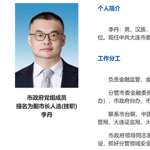 大连市人民政府官网显示,“70后”李丹为大连市委常委、市政府党组成员,挂职副市长,主要负责金融监管、金融中心建设、国防动员、台港澳事务等方面工作。分管市委金融委员会办公室(市地方金融管理局)、市国动办(市人防办)、市政府台办、市政府港澳办。联系市台联,中国人民银行大连市分行、国家金融监督管理总局大连监管局、大连证监局,大连商品交易所,驻连金融机构。在履新市政府之前,李丹曾任进出口银行法律事务部副总经理、厦门分行行长。