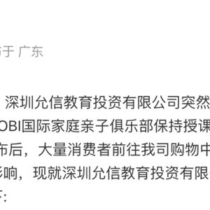 6月20日午间,深圳欢乐海岸官方微博发布公告称,6月19日,深圳允信教育投资有限公司突然对外宣布校区调整,自2024年6月19日起,仅IBOBI国际家庭亲子俱乐部保持授课服务(以下简称IBOBI欢乐海岸店)。上述通知发布后,大量消费者前往我司购物中心维权,给我司造成了极大的管理压力及负面影响。