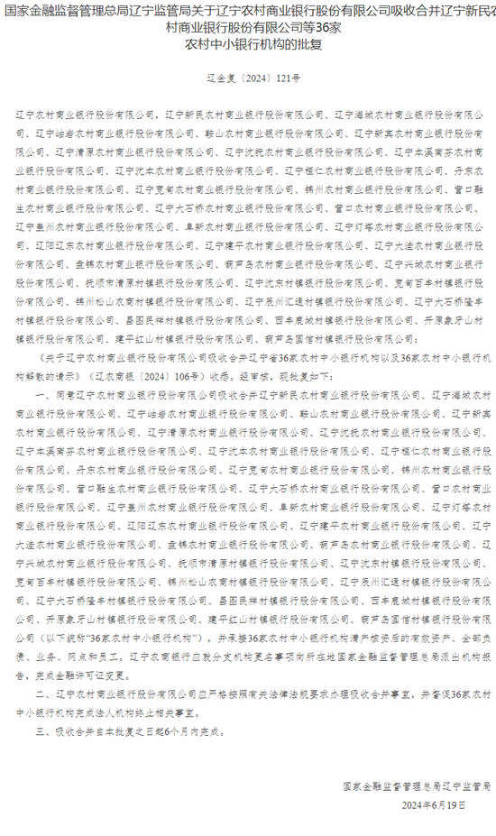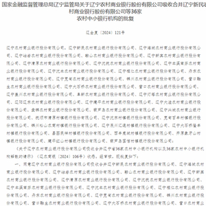 近日,金融监管总局辽宁监管局发布公告,同意辽宁农村商业银行吸收合并辽宁新民农村商业银行等36家农村中小银行机构,并承接前述36家农村中小银行机构清产核资后的有效资产、全部负债、业务、网点和员工。