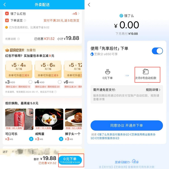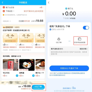 今年4月,饿了么开启一轮对“先享后付”功能的集中推广,有用户在点外卖时发现,页面上原本的付款键变成了“0元下单”,但付款方式在这个页面无法自主修改,进入下一个页面后仍然无法使用其他方式付款。“怎么也点不掉,我最后退出了软件,重新进入饿了么下单,这个推广页面才不再出现,一开始以为我只能选择‘先享后付’支付。”消费者毛小姐向记者提出她的质疑。