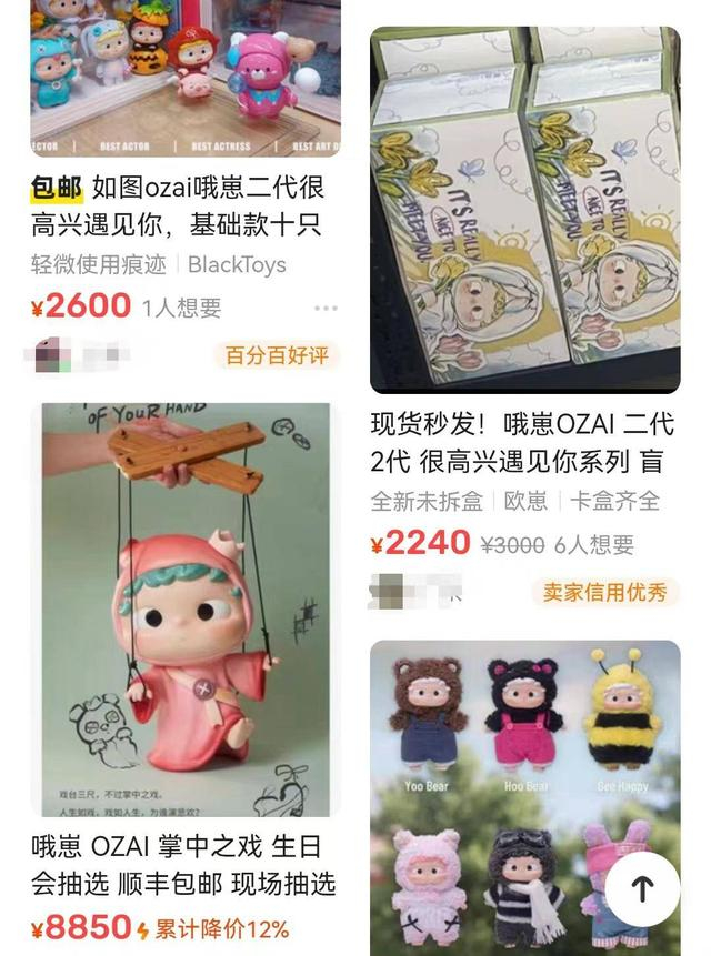 二级市场哦崽盲盒的价格情况似乎也印证了大家怀疑本次盲盒销售已被大量黄牛盯上的猜测,记者在二手交易平台搜索,原价129元的盲盒已成倍加价,基础款售价大约在近千元,大多数款式在两千元左右,其中稀有的隐藏款一个售价达近五千元,还有卖家挂出了6500元的超高价格。