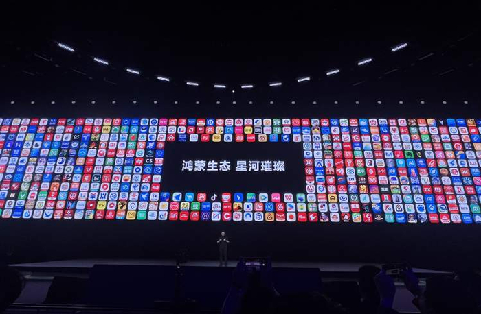 “今天,我们已成为时代的滚滚洪流,我们要感谢创造鸿蒙速度的每一位开发者、每一个伙伴、每一位讲师、每一位消费者,我们要感谢淘宝、支付宝、美团、京东、抖音、今日头条、钉钉、小红书、微博、B站、高德、金山WPS等等几千家伙伴的支持,你们都是鸿蒙时代的合伙人。”