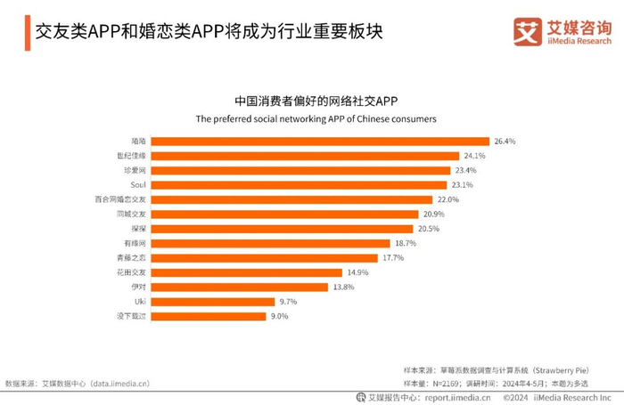 iiMedia Research(艾媒咨询)数据显示,婚恋社交平台推出的APP中,世纪佳缘、珍爱网、百合网婚恋交友等APP受消费者欢迎,分别占比24.1%、23.4%、22.0%;陌生人社交APP中,陌陌(26.4%)和Soul(23.1%)更受消费者喜爱。艾媒咨询分析师认为,陌陌、Soul等以陌生人社交为主的APP,通过强化社交、心灵上的慰籍以满足国民对社交以及恋爱的需求,拓宽了婚恋社交服务行业的服务模式。