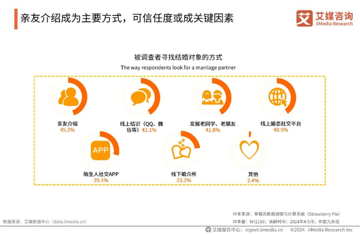 iiMedia Research(艾媒咨询)调研数据显示,四成以上消费者对婚恋平台表示担忧,超半数消费者对相亲呈积极态度,消费者倾向于通过亲友介绍(45.2%)、线上结识(42.1%)、发展老同学老朋友(41.8%)等方式找寻婚恋对象。艾媒咨询分析师认为,当前年轻群体更看重感情和精神层面的契合,而非仅仅基于物质条件的考量,且往往会选择信任度高的方式或偏向社交的平台而非目的性更强的婚恋服务平台。