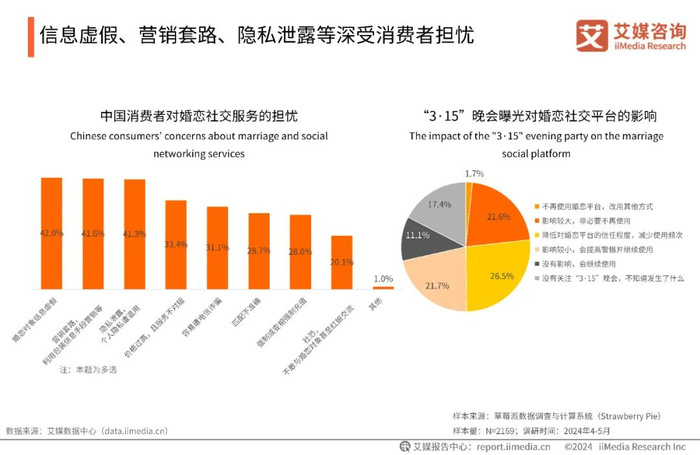 iiMedia Research(艾媒咨询)数据显示,超四成消费者对婚恋社交服务中的婚恋对象信息虚假(42.0%)、营销套路(41.6%)、隐私泄露(41.3%)等方面表示担忧;近半数人因“3·15”晚会曝光的婚介平台乱象而降低使用频率。艾媒咨询分析师认为,多数消费者对婚恋社交服务的可信度表示担忧,主要原因有部分婚介平台的营销套路乱象、部分社交APP电信诈骗泛滥以及个人信息泄露遭滥用等。