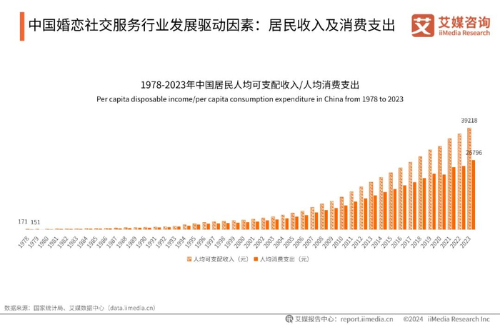 1978-2023年,随着国民经济稳步发展,中国居民人均可支配收入持续上涨,居民消费信心不断增强,催生更多元的消费需求,如除物质生活外的精神需求。数据显示,2023年,中国居民人均可支配收入达39218元,人均消费支出达26796元,占可支配收入的68.3%。国民消费情况较为乐观,期望找寻另一半的单身群体在婚恋社交服务需求和婚恋相关消费也逐渐提高,婚恋社交服务行业前景较为乐观。