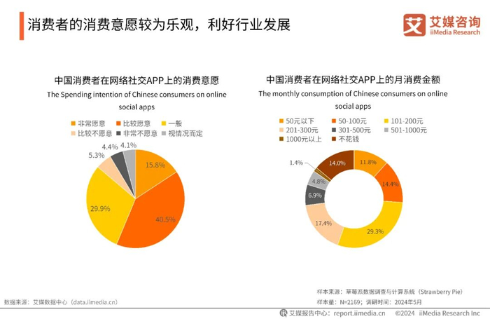 iiMedia Research(艾媒咨询)数据显示,有56.3%的用户愿意购买网络社交APP提供的付费服务,其中15.8%的用户消费意愿强烈;每月在网络社交APP上消费金额为50-300元的用户占61.1%,有14.0%的用户基本不在网络社交APP上消费。艾媒咨询分析师认为,消费者在网络社交APP付费服务的消费意愿上表现相对良好,月消费金额不高,其原因可能在于该类APP提供的付费服务较少或性价比较低。
