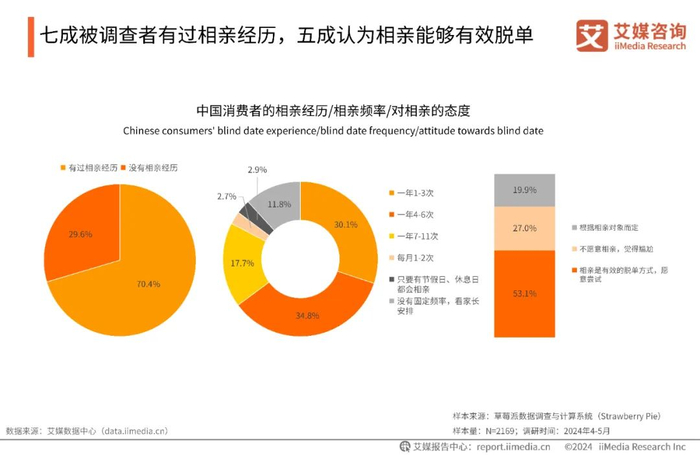 iiMedia Research(艾媒咨询)数据显示,70.4%的被调查者有过相亲经历,一年相亲1-6次的被调查者占多数(64.9%),超半数被调查者认为相亲是有效的脱单方式。艾媒咨询分析师认为,多半消费者认为相亲能够有效脱单,表明大多数单身群体对相亲、婚恋等态度比较积极,婚恋社交服务行业市场前景较为广阔。