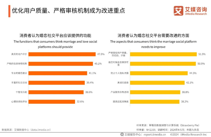 iiMedia Research(艾媒咨询)数据显示,真实的用户评价(47.0%)、严格的信息审核机制(45.1%)成为消费者最希望婚恋社交平台提供的功能,严格管控用户质量、防低俗、诈骗(51.5%)以及婚恋对象信息真实可靠(50.9%)成为消费者认为婚恋社交平台最需要改进的方面。艾媒咨询分析师认为,用户质量、信息可靠度等是婚恋社交平台提供其他服务的基础,平台需要优化用户质量、严格审核机制以提高平台信誉和用户的信任度。