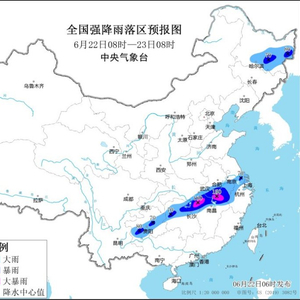 预计,6月22日08时至23日08时,贵州中部、湖南北部、湖北东南部、江西北部、安徽南部、江苏南部、上海北部、浙江西部及黑龙江东部和南部等地有大到暴雨,其中,湖南东北部、湖北东南部、江西北部、安徽西南部等地部分地区有大暴雨(100~180毫米);上述部分地区伴有短时强降水(最大小时降雨量30~50毫米,局地可超过80毫米),局地有雷暴大风等强对流天气(见图1和图2)。中央气象台6月22日06时继续发布暴雨黄色预警和强对流天气黄色预警。