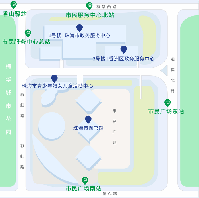 沿梅华西路或迎宾北路均可到达市民服务中心地下停车场(办事群众专用停车场)