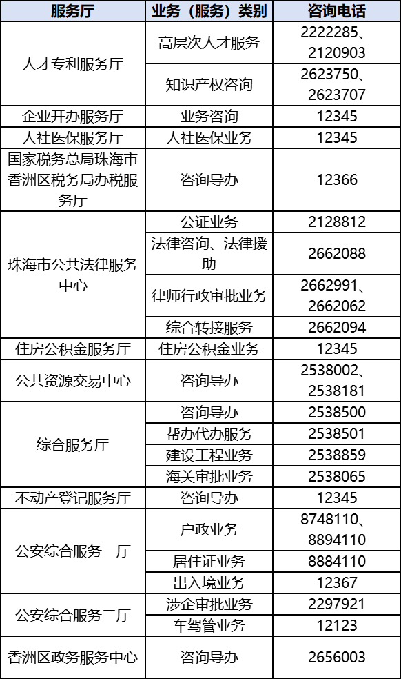珠海市级政务服务大厅(香洲区红山路230号)、市不动产登记服务厅(香洲区九洲大道中2002号)、市公共资源交易中心(香洲区红山路288号国际科技大厦二楼)、市人社医保服务厅(香洲区红山路245号)、公安综合服务一厅(香洲区翠景路116号香洲区政务服务中心公安业务大厅、香洲区梅华东路237号香湾综合服务中心公安业务大厅、香洲区南溪村南溪派出所凤山街道办公安业务大厅)、公安综合服务二厅(香洲区红山路市级政务服务大厅二楼公安专厅、香洲区梅华西路2330号车管服务大厅)、市公共法律服务中心(香洲区梅华西路96号、香洲区夏美路25号)、国家税务总局珠海市香洲区税务局办税服务厅(香洲区九洲大道西1888号)于2024年6月22日、23日搬迁至珠海市民服务中心1号楼(珠海市政务服务中心)。新址于6月24日上午9:00起对外试运行,7月1日正式运行,原址自6月22日起不再办理相关业务。