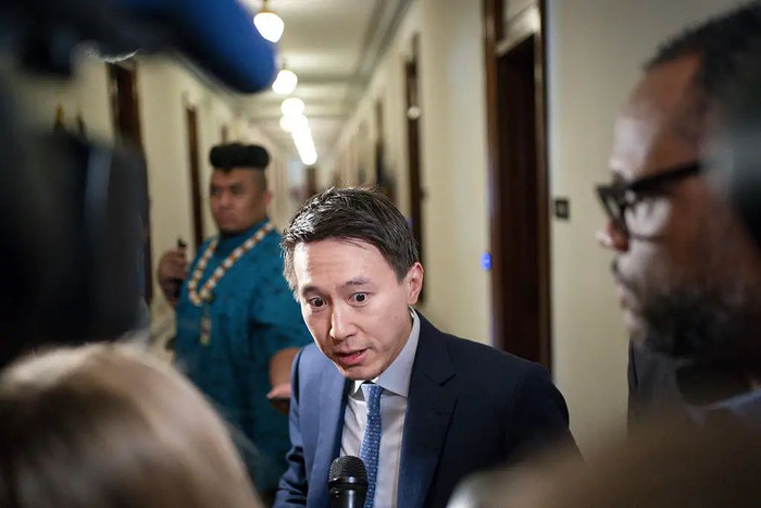 3月14日,美国华盛顿特区,TikTok CEO周受资在与宾夕法尼亚州民主党参议员约翰·费特曼会面后接受媒体访问(视觉中国)