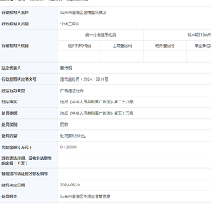 金融界消息,近日,汕头市澄海区艺博星玩具店因广告违法行为,被汕头市澄海区市场监督管理局罚款1200元。