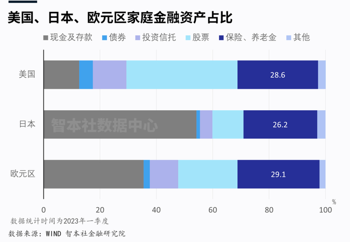 对比美国、日本、欧洲区的家庭资产配置结构,你会发现这三大经济体的家庭资产配置的风险偏好差异大,但有一个共同特征:在保险和养老金上的配置比例高度一致,均在26-30%之间。