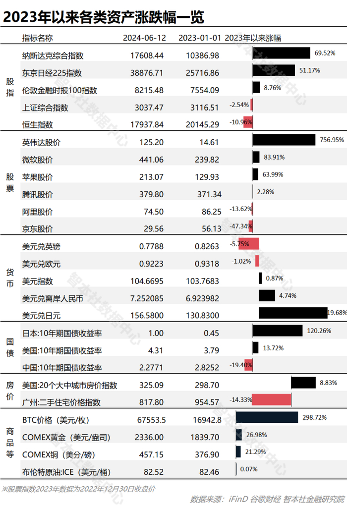 全球资产配置一个非常重要的特征是对冲性。所谓东方不亮西方亮,放眼全球,不论经济处于什么周期、出现什么风险,总有资产在涨。数据显示,从2023年到2024年6月,全球表现最好的股票是美股,纳指上涨近70%,王者属英伟达,暴涨756%;其次是日股,日经225指数上涨51%。收益率最高的债券是美债,当前10年期收益率为4.3%,日债收益率因政策调整而翻倍。表现最好的商品是比特币,大涨298%,其次是黄金和铜,分别为29%和26%。