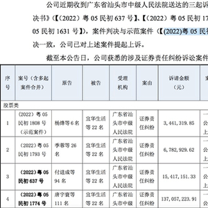宜华生活虚假陈述案迎来新进展。近日,宜华生活在股转系统公告涉及证券责任纠纷事宜的诉讼进展。有3起诉讼案件在近期迎来一审判决,其判决结果与“示范案件”一审判决一致。