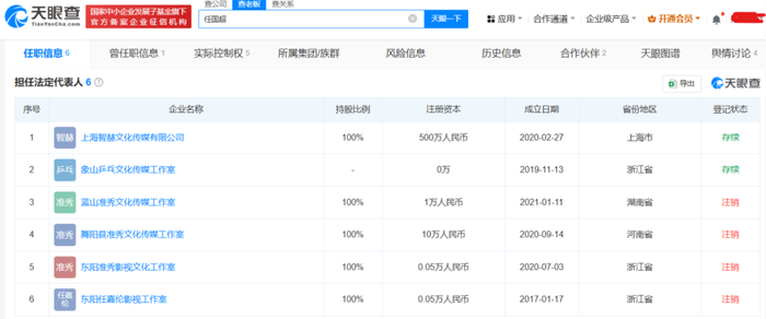 天眼查显示,任嘉伦为6家公司担任法定代表人,其中2家公司存续,分别为上海智赫文化传媒有限公司和象山乒乓文化传媒工作室;另外4家公司已经注销。