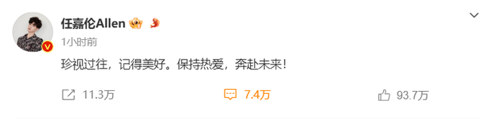 6月23日,演员@任嘉伦Allen发文:“珍视过往,记得美好。保持热爱,奔赴未来!”