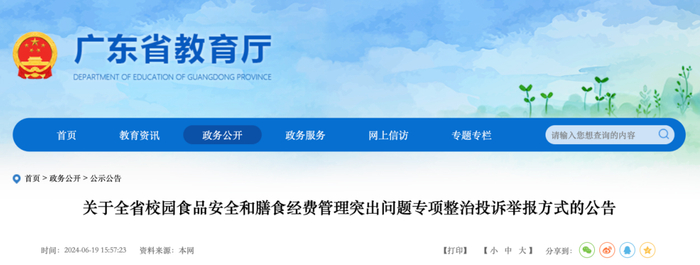 为全面落实习近平总书记“四个最严”要求,认真贯彻中央纪委国家监委集中整治群众身边不正之风和腐败问题的要求,根据教育部在各地开展校园食品安全和膳食经费管理突出问题专项整治行动的部署,决定自2024年即日起至10月开展全省校园食品安全和膳食经费管理突出问题专项整治。为进一步畅通广大师生、家长、社会公众投诉举报渠道,建立家校社协同监督机制,全省各级教育行政部门、各高校和省属中小学校设立了投诉举报热线电话和邮箱,受理相关投诉举报。