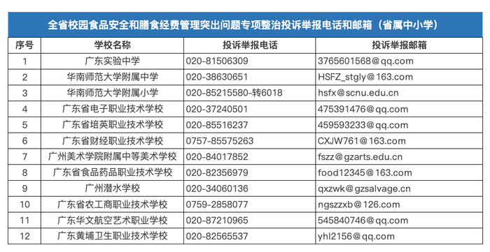 此外,为进一步畅通投诉举报渠道,近日,广东省教育厅同步公开了全省各级教育行政部门、各高校和省属中小学校的投诉举报方式。