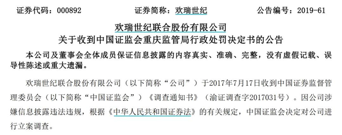 然而,2019年,欢瑞世纪却因连续四年财务造假,总额上亿元,公司及相关负责人均遭到中国证监会重庆监管局行政处罚。