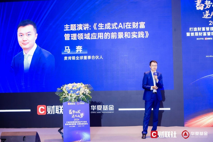 6月21日,财联社携手华夏基金在苏州举办“蓄势而发 逆风起势”第三届财富管理论坛暨华尊奖颁奖典礼,会上,麦肯锡全球董事合伙人马奔以《人工智能技术在财富管理领域应用的前景和实践》为主题,围绕当下热门概念“生成式AI”发表了主题演讲,并带来了关于人工智能的新思考。