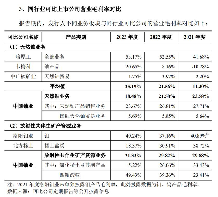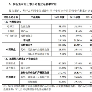 首先是在同行业可比上市公司方面,由于目前A股尚无从事天然铀采冶相关业务的上市公司,所以中国铀业选取了哈原工、卡梅科两家境外天然铀厂商以及H股上市的中广核矿业作为天然铀业务可比公司。