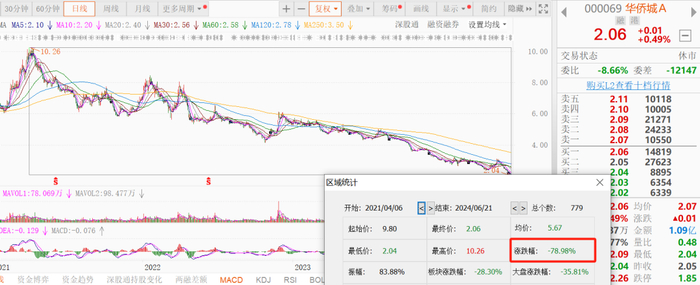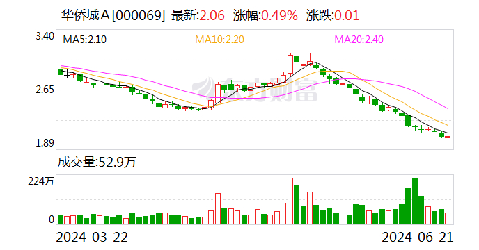 今年以来,华侨城A股价大幅下行。截至6月21日,收盘价报2.06元/股,总市值跌至165.6亿元。