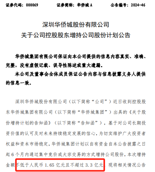 6月23日晚间,华侨城A公告称,控股股东华侨城集团计划增持公司股份,增持金额1.65亿元至3.3亿元。