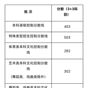 今年的本科录取控制分数线为403分,比去年的405分下降了2分;特殊类型招生控制分数线为503分,比去年的504分下降了1分;艺术类本科文化控制分数线为302分,比去年的304分下降了2分;体育类本科文化控制分数线为282分,比去年的284分下降了2分。此外,今年新增了舞蹈类、戏曲类本科文化控制分数线,为220分。