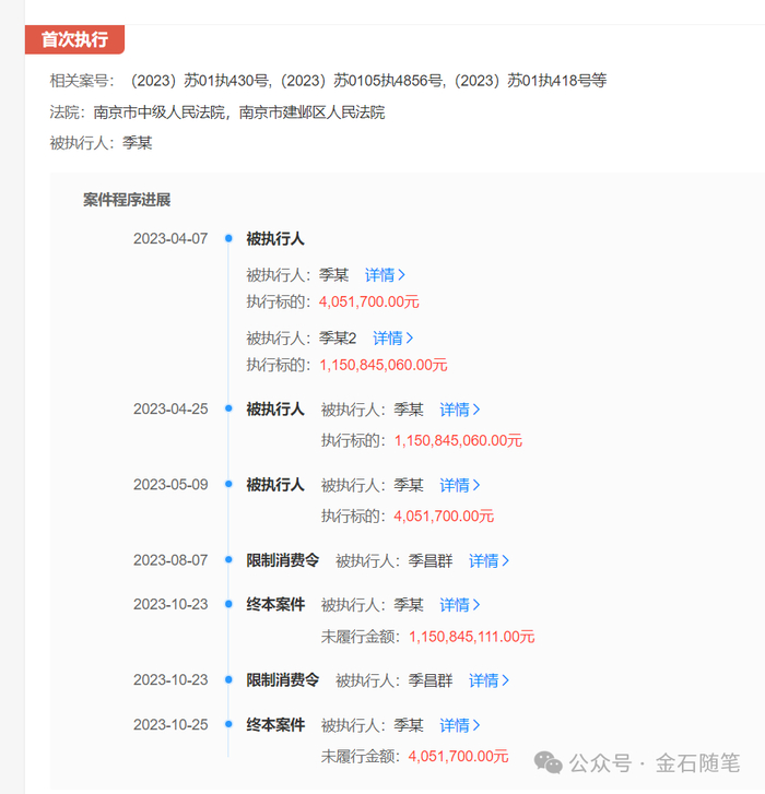 2019年11月,国元信托将丰盛系南京第四建筑集团诉诸法院,2023年4月法院将季昌群列为被执行人,仅国元信托这一笔就被执行11.5亿,4年过去了依然未有偿还,季昌群也沦为老赖。不出意外,国元信托这11.5亿将成为坏账。