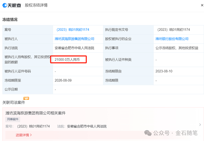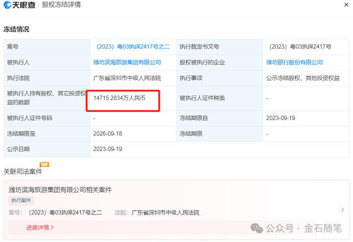 至于本次被冻结股权的滨海旅游集团,被执行金额4.4亿,有10次被列入被执行人。2023年9月因未及时偿还平安信托宏泰八百三十四号集合资金信托计划本息200多元的贷款,竟然冻结了滨海旅游在潍坊银行1.7亿元的股权。