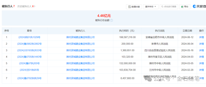 6月12日,潍坊滨城建设集团有限公司新增一条执行人信息,执行金额2亿元,原因是潍坊滨城建设集团有限公司未能偿还到期债务,而潍坊滨海旅游集团和潍坊滨海央城开发建设为担保人,因此被一起列为被执行人。