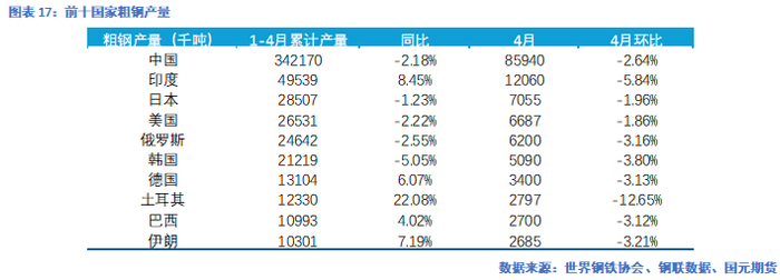 根据世界钢铁协会数据显示,1-4月全球粗钢累计产量为6.24亿吨,同比下降0.42%。除中国外,粗钢累计产量为2.82亿吨,同比增加1.8%;其中增幅居前的国家是土耳其、印度、伊朗等。1-4月土耳其粗钢累计产量为1233万吨,同比增加22.08%,全年由于地震影响生产基数较低。1-4月印度粗钢累计产量为4953.9万吨,同比增加8.44%,于10%的增长目标相比,略显缓慢,下半年生产节奏或加快。