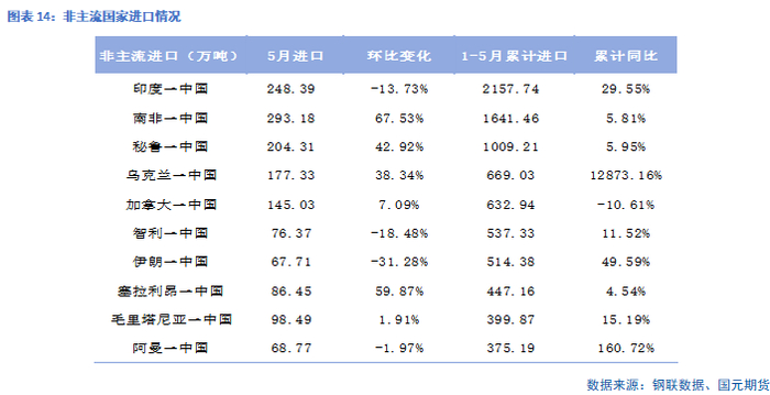 截至6月14日,中国45港口铁矿周均到港量为2404.59万吨,同比增加7.59%。统计局数据显示,1-5月中国铁矿进口量为5.14亿吨,同比增加7.08%。其中增量主要体现在巴西进口及非主流进口。1-5月非主流(除澳巴)进口铁矿1.03亿吨,同比增加23.66%。非主流方面,进口量居前的国家是印度、南非、秘鲁,增量比较突出的是乌克兰。印度方面,2023年印度粗钢产量为1.408亿吨,为达到2030 财年粗钢年产能在3 亿吨,年同比增速维持在10%,铁矿石产量也按照10%增加。目前看,印度国内铁矿石产量充足,能够满足本国粗钢生产,后市出口量仍会维持高位。乌克兰铁矿石出口受地缘政治影响减轻,目前发运水平以及恢复至战前常态。