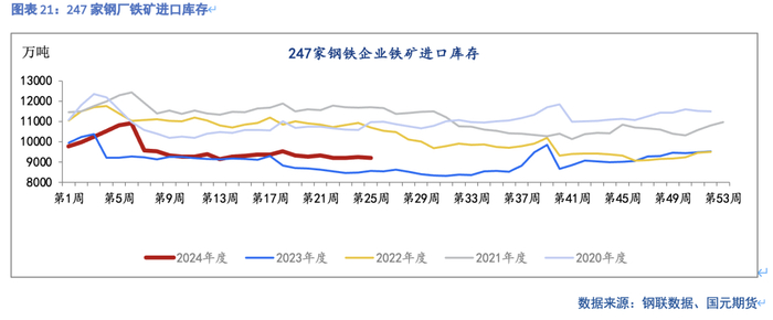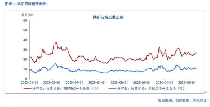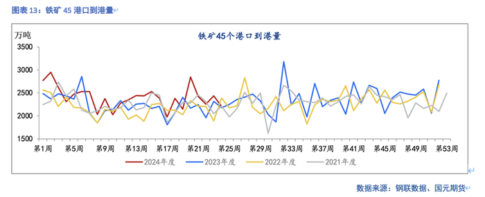 供应方面,澳矿上半年发运受天气影响,有所下降,下半年会有一定的增量。非主流方面,地缘问题对铁矿发运的影响逐渐消退,我们认为下半年有300万吨/月的增量。综合来看,我们预期下半年铁矿到港月均增量在450万吨。需求方面,在粗钢平控的影响下,下半年的铁水产量预计会前高后低。受海运费上升的影响,铁矿石运输成本较去年增加20-40元/吨