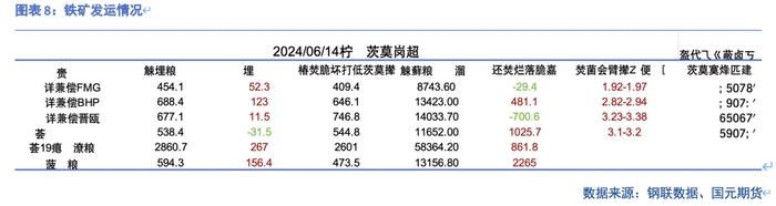 从年度目标发运量来看,FMG矿山24年度(2023.07-2024.06)目标发运量为1.92-1.97亿吨,较上一年度发运目标增加500万吨;BHP矿山24年度(2023.07-2024.06)产量指导目标为2.82-2.94亿吨,较上一年度增加400万吨;力拓矿山24年度发运目标为3.23-3.38亿吨,较上一年度增加300万吨;淡水河谷24年度产量目标为3.1-3.2亿吨,维持不变。