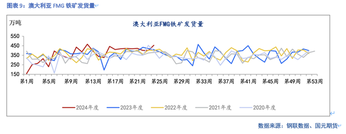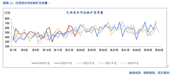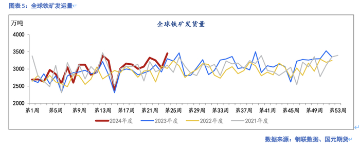 截至6月14日,淡水河谷发运为11652万吨,较去年同期增加1025.7万吨,发运进度为37.59%,发运节奏偏快。VALE一季度铁矿石生产虽受到雨季影响,但前期设备完善,整体运营出色,产销实现同比双增。虽然Vale宣布2024年度生产目标仍维持3.1-3.2亿吨不变,但是去年产量是3.21亿吨,今年产量很有可能维持在目标上限水平。