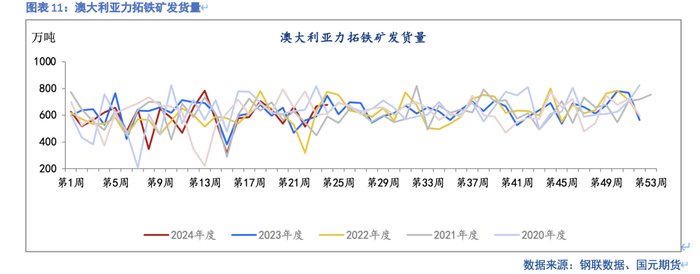 截至6月14日,力拓矿山发运14033.70万吨,较去年同期减少700.6万吨,发运进度为43.45%。一季度受到澳洲飓风的影响,港口发运走低,导致上半年力拓发运进度较慢。按照最低目标发运来看,下半年较上半年会有4300吨的增量。